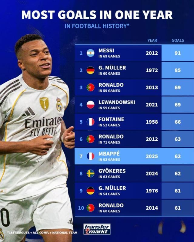 姆巴佩今年进球已达62球,进入历史前十,德转盘点了足坛历史自然年进球纪录。足坛自然年进球纪录: